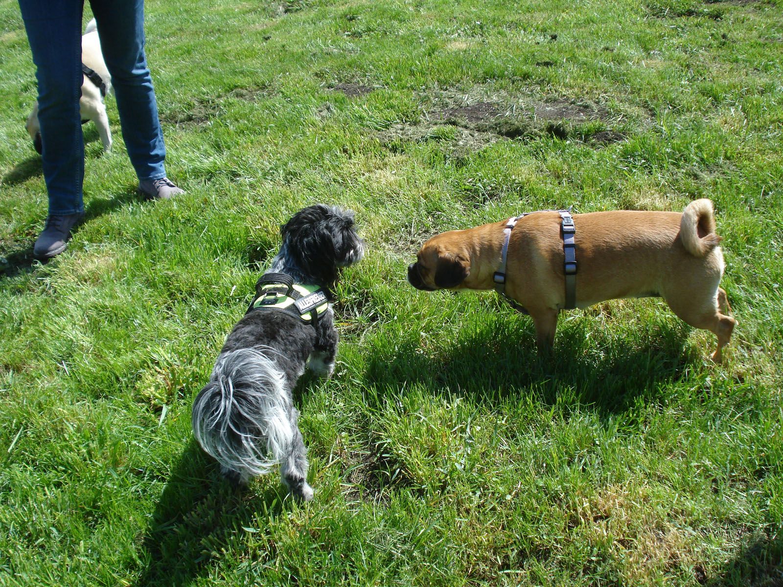 Halter von Hunden, die Spaß daran haben, sich mit Artgenossen zum Spielen zu treffen